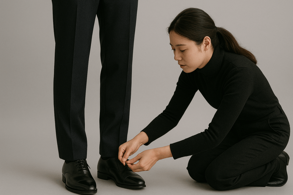 もちろん、コンポジ(モデルの基本データ)を参考に調整はしますが、腰の位置や姿勢のクセによって見え方が変わるため、何度もやり直すことも少なくありません。さらに素材によっては生地が滑りやすかったり、光の当たり方で長さが違って見えたりと、本当に一筋縄ではいきません。だからこそ、裾上げの作業と同時にヘアメイクを進めるなど、効率よく現場を動かす工夫が欠かせません。頭の中では「今どの作業を優先するか」「次のカットに向けて何を準備するか」を常に組み立てながら動いています。集中力と段取り力が問われる時間です。